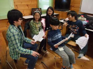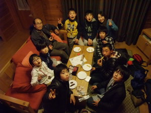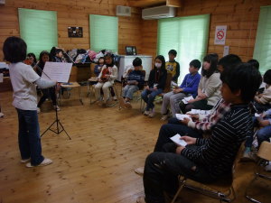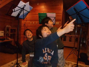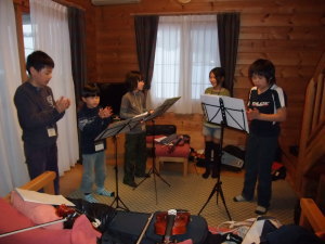二日目の夜は、ひとつのコテージに有志が集合、全員合奏の追加練習をしました♪