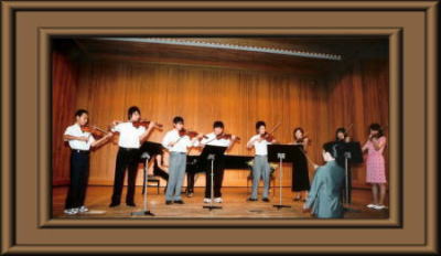 ♪<合奏の様子>♪ 二組に分かれて演奏しました。 ←こちらのグループは 葉加瀬太郎作曲“エトピリカ”を演奏。 メンバーは中学生から大人まで。 |