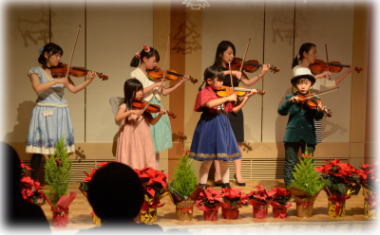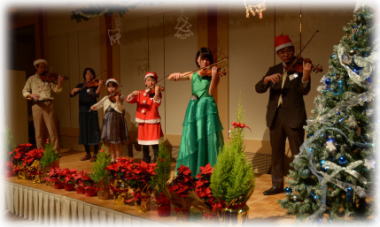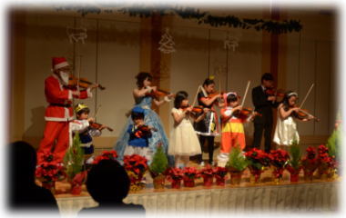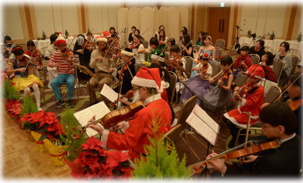 メインのベートーヴェンの第九! 人数が増えて、より厚みのある演奏にパワーアップしました♪ 楽器やコーラスなど、生徒さんとそのご家族のみなさんもご一緒に、パーティー参加者全員での合奏・合唱です♪ ![]() |