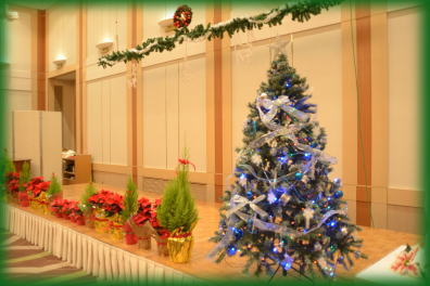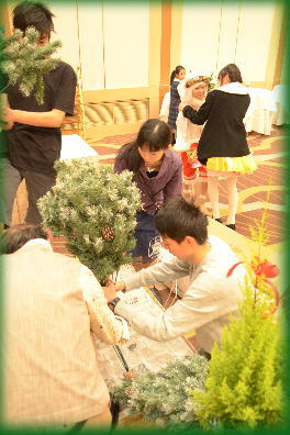 ツリーの飾りつけ、イルミネーション、お花のセッティングなど 早めに会場に来てくれた生徒さんのご協力を得て、会場の準備! 今回は上にも、もみの飾りをつけました☆ |