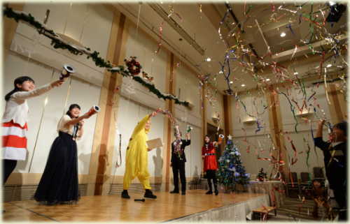 パーティーの終盤は、キャンドルを手にしてキャンドルリレー、 そして生徒さんたちによる合唱『オーホーリーナイトの2部合唱☆ ほのかなキャンドルの灯と共に、聖なる歌声が会場を包み込みました♪ ![]() パーティーの締めくくりは、全員でクラッカーでにぎやかに!! コンサートで演奏した第九の音楽にのせて、気分を盛り上げて・・・ 「メリークリスマス!!!」 パパパパーン!!! ![]() |