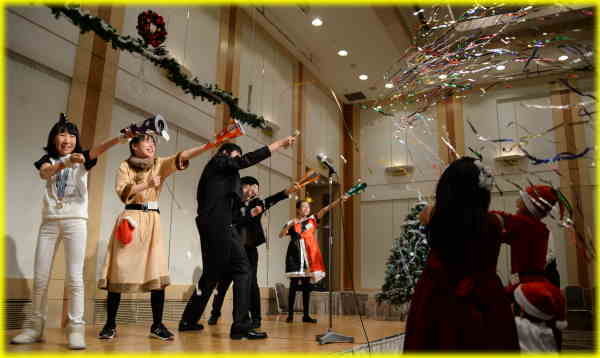 パーティーも終わりに近づいてきました。 終盤は、キャンドルを手にしてキャンドルリレー、そして生徒さんたちによる合唱『オーホーリーナイトの2部合唱です☆ 聖なるキャンドルの灯と共に、清らかな歌声が会場を包み込みました♪ ![]() パーティーのラストは、全員でクラッカーで明るく締めくくり!! コンサートで演奏した第九の音楽にのせて、気分を盛り上げて・・・ 「メリークリスマス!!!」 パパパパーン!!! ![]() |